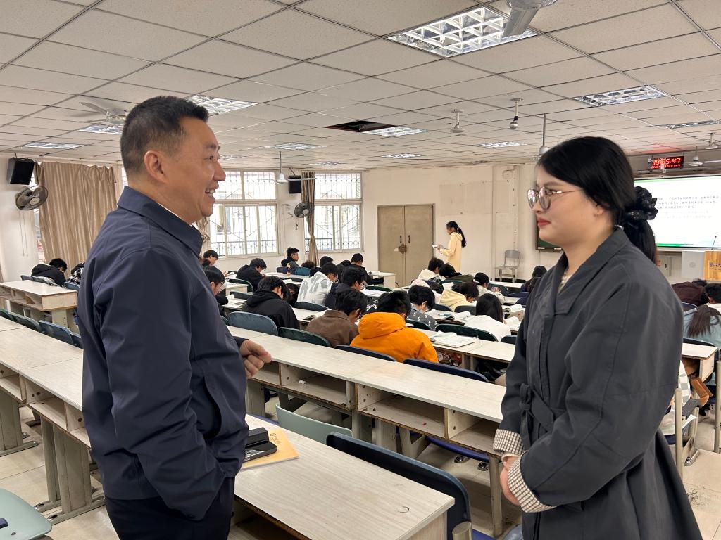 胥刚随堂听取了马克思主义学院青年教师吴笛讲授的《思想道德与法治》课程。听课过程中,胥刚认真记录教学环节,仔细观察师生互动,对教学案例的选取、理论阐释的深度以及课堂氛围的调动进行了全方位的了解。